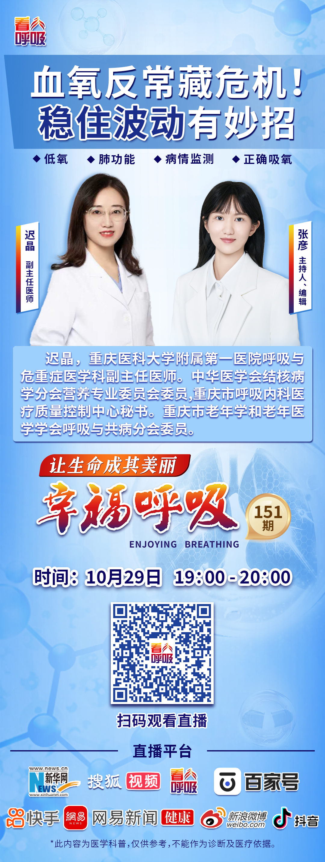 10月29日(本周三)晚上19:00,《幸福呼吸》直播间特邀重庆医科大学附属第一医院呼吸与危重医学科副主任医师迟晶,聊一聊“血氧反常藏危机!稳住波动有妙招”,带大家识别那些容易被忽略的血氧反常变化,并且学会在第一时间采取正确措施,在日常生活中科学稳住血氧、守护呼吸健康。