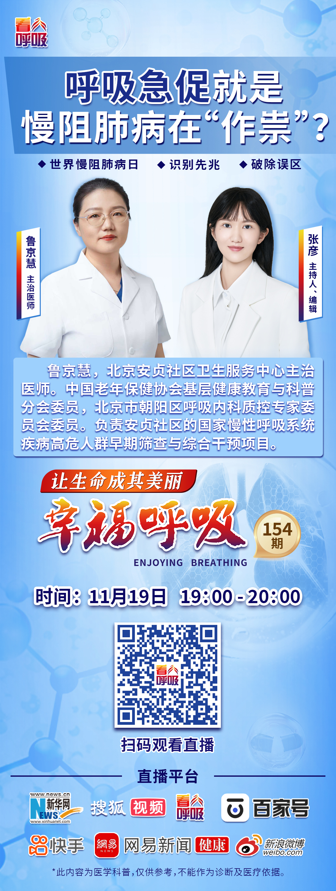 11月19日(本周三)晚19:00,北京安贞社区卫生服务中心的主治医生鲁京慧将走进《幸福呼吸》直播间,和我们聊聊“呼吸急促就是慢阻肺病在‘作祟’?”。