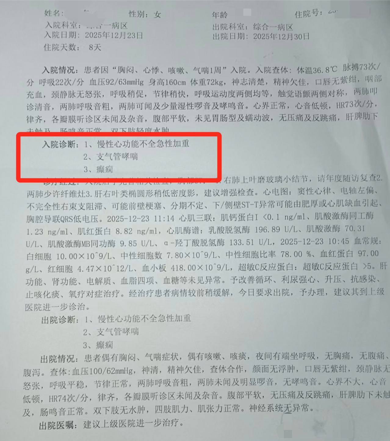哮喘一步步拖垮身体,对心脏的影响越来越明显。后来复查时,医生告诉我心脏已经增大了,考虑是哮喘反复发作加重了心脏负担、影响了心功能。随着时间的推移,我患上了让人闻之色变的疾病,即心力衰竭。如今,我的心功能已经达到了四级,这是最严重的级别,哪怕只是慢慢走几步路都会喘得厉害,晚上更是无法平躺睡觉,否则就会喘不上气,只能靠着床头吸氧才能勉强维持呼吸。