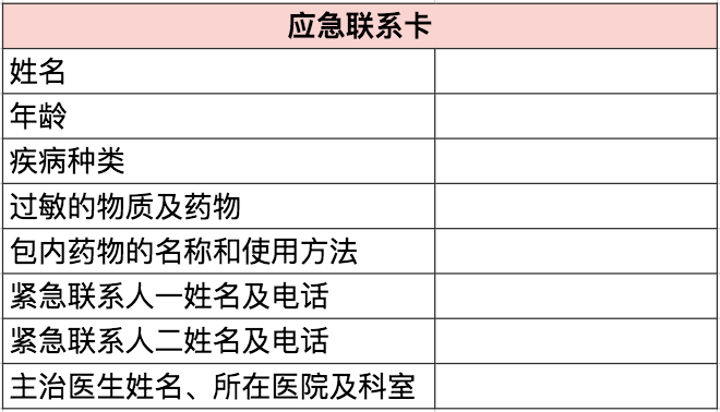 急救包里最不能少的是应急联系卡,上面写明了我的姓名、年龄,标注了咳嗽变异性哮喘和癫痫,以及我主要过敏的物质,还列出了急救包内所有药物的名称、具体使用方法。同时还注明了两位紧急联系人的姓名、电话,还有我的主治医生的姓名、所在医院及科室。
