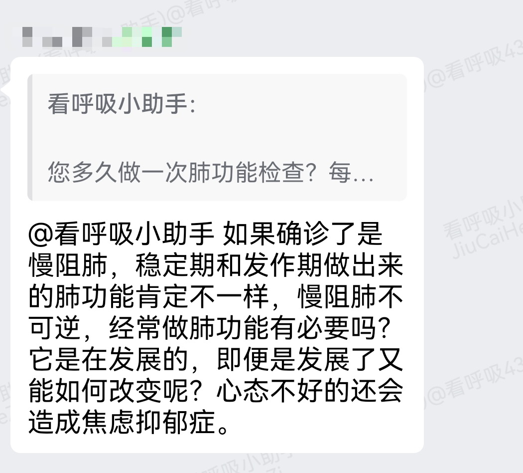 “我每次拿到肺功能检查报告都不知道怎么看,孩子帮我分析了一下,说最近这次的结果比以前好了一点,难道说我的病情要逆转了?”在病友交流群里,慢阻肺病患者周姐迫不及待地分享着她的“惊喜发现”。