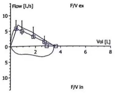 “此外,肺功能报告中还有一个非常重要的图形,即流量-容积曲线。用力吸足气然后以最快的速度、最大的力气呼出去,这个过程中,呼吸速度和肺里剩余的气量被画成了一条曲线,这就是流量-容积曲线。”李老师讲道。