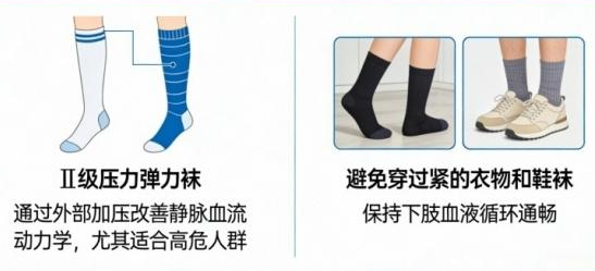 穿对衣物,也可为血管“减压”。有血栓病史、孕妇、肥胖、老年人等高危人群,可在医生指导下佩戴医用弹力袜。这类袜子通过梯度递减的压力设计(踝部压力最高,向大腿方向逐级降低),挤压下肢静脉,促进血液向心回流,减少血液淤滞。不过,严重外周动脉疾病、腿部严重皮炎或感染、重度水肿人群要谨慎使用医用弹力袜。另外,建议大家在长途旅行时穿着宽松、舒适的衣服和鞋袜,避免过紧的腰带、裤袜压迫下肢血管、阻碍血液回流。