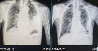 图片1:两性霉素B脂质体静滴治疗10天后胸片对比左肺实变影较前有所吸收好转。