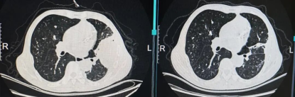 图片2:两性霉素B脂质体静滴治疗28天胸部CT对比左肺实变影基本完全吸收好转。