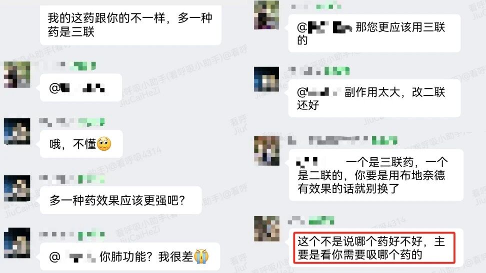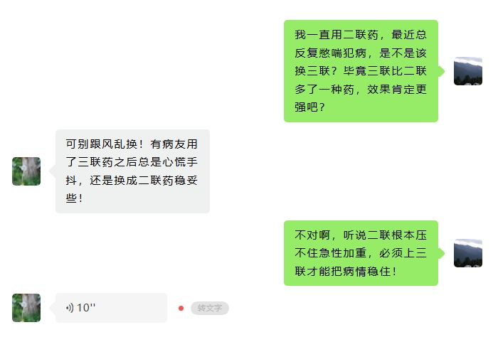 最近,在《看呼吸》的患者交流群里,关于二联药和三联药的讨论热闹起来。经验之谈、道听途说在群里交织碰撞,大家有着各自的“情报”与顾虑。