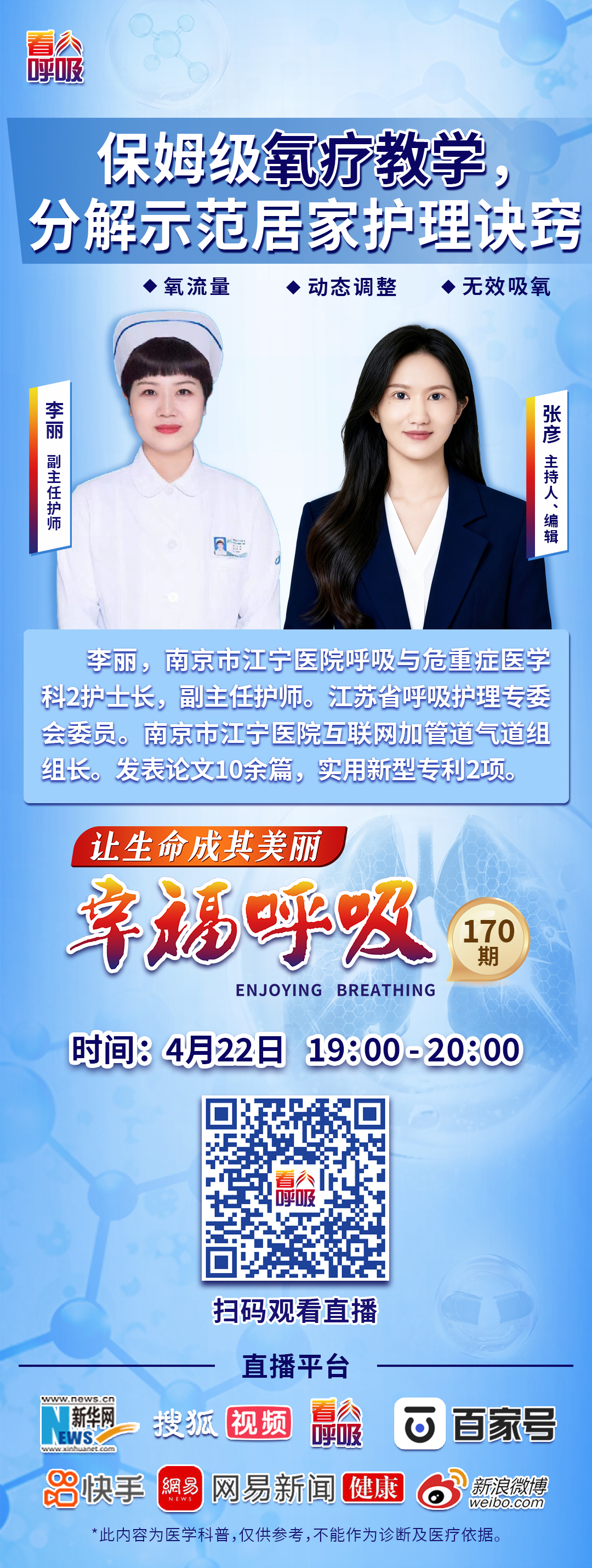 不过,大家先不必慌张。4月22日(本周三)晚上19:00,南京市江宁医院呼吸与危重症医学科副主任护师李丽,将做客《幸福呼吸》直播间,聊一聊“保姆级氧疗教学,分解示范居家护理诀窍”。